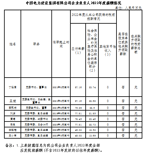 中國電力建設集團有限公司企業(yè)負責人2022年度薪酬情況